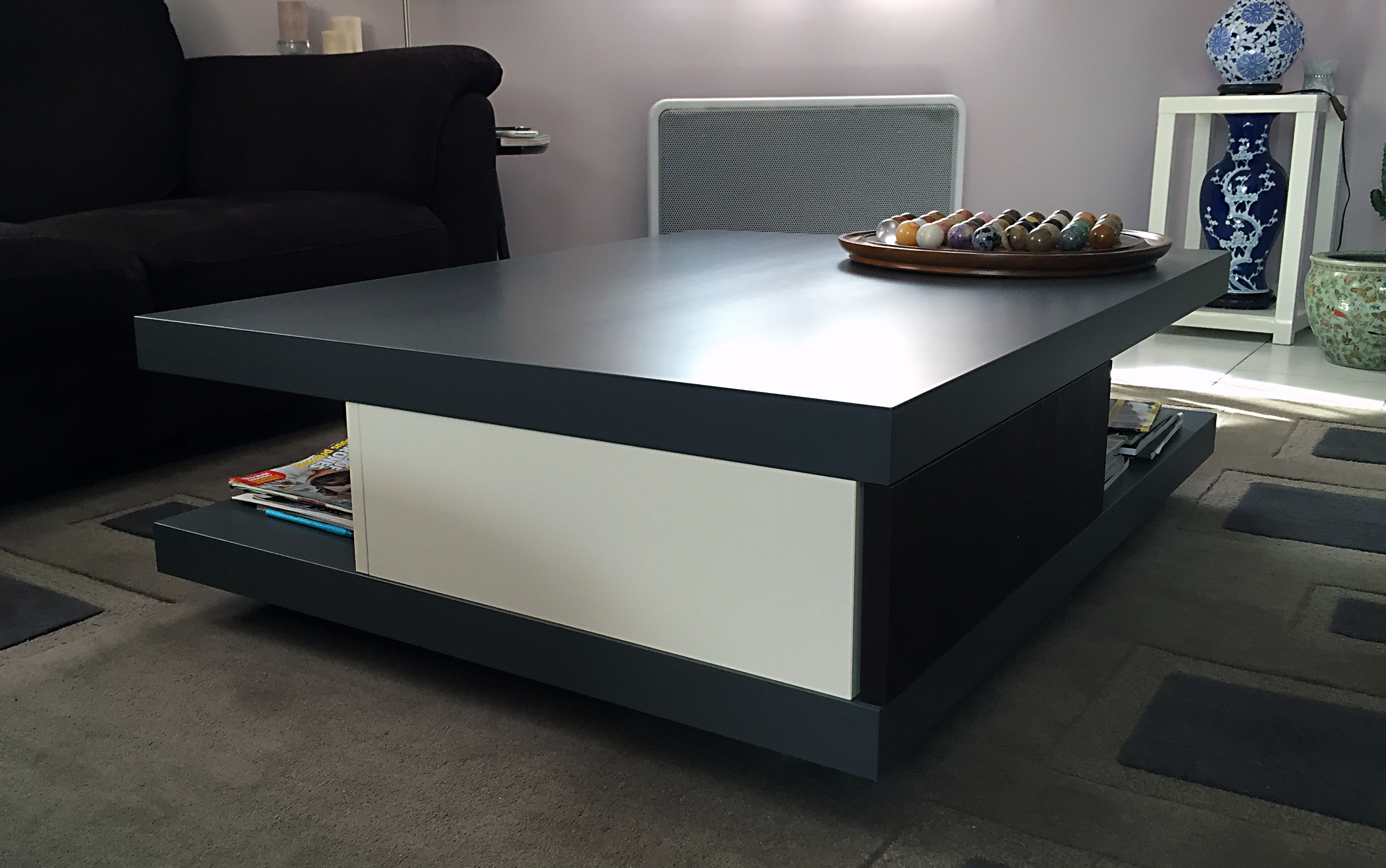 Une petite table basse dans un salon annexe